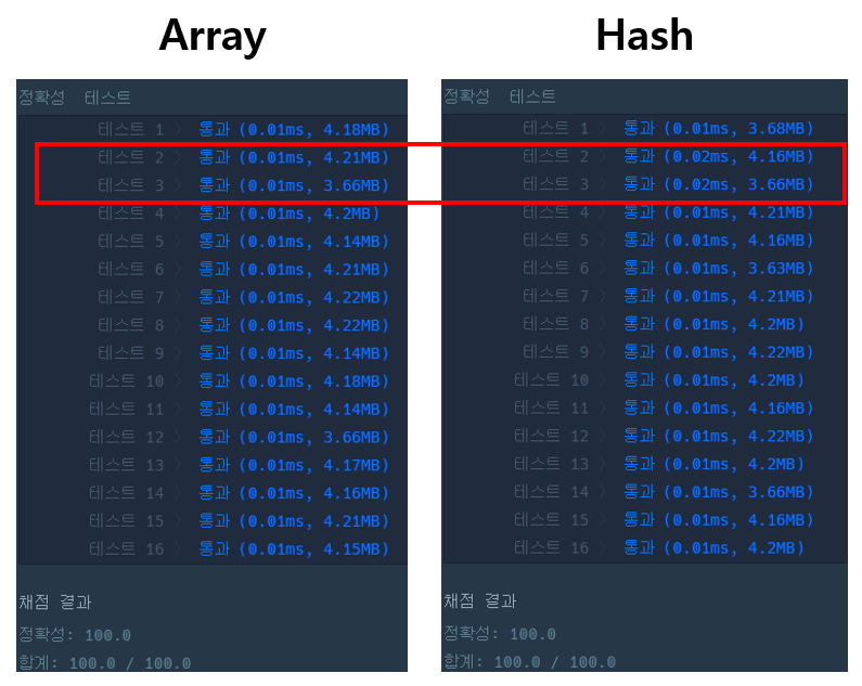 실행결과: 특정 데이터에서 Hash 기반 구현이 Array 기반 구현보다 느린 것을 확인할 수 있습니다